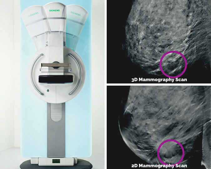 Traditional 2D digital mammography takes two-dimensional pictures of the breast. With 3D mammography, the breast is scanned into multiple layers and the radiologists can examine the tissue one thin layer at a time. Overlapping tissue could disguise or hide the fine details that could be signs of early cancer, 3D mammography allows the tissue to be more visible and less likely to be hidden with overlapping tissue.